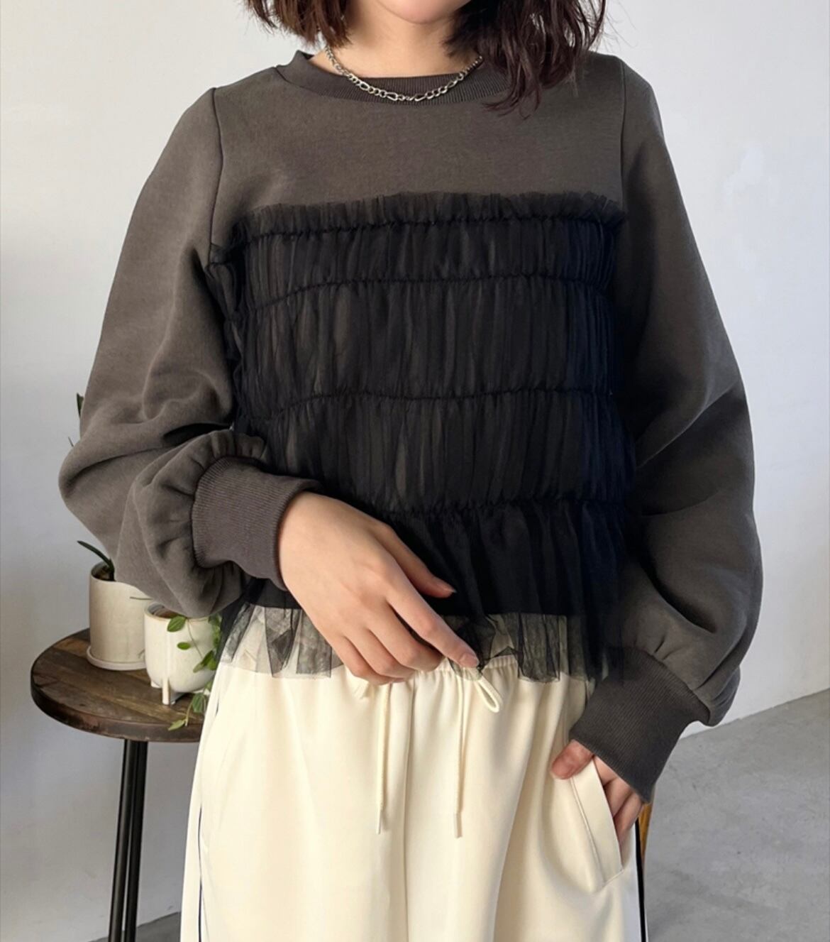 ビスチェライクにあしらったデザインが大人カジュアルなの裏起毛ボリューム袖プルオーバー。柔らかく暖かみのある裏起毛素材で肌触り良く、秋冬から春にかけてロングシーズンお使いいただけます。タックの入ったボリューム袖のデザインで袖口がリブできゅっとなっているのでメリハリのある女性らしいシルエットに仕上げました。立体感のあるシャーリングチュールがトレンド感のあるスタイリングにアップデートしてくれます◎ショート丈とボリュームのある袖のバランスが今年らしく、合わせるボトムを選ばずコーディネートがきまります。【素材】ポリエステル78% 綿22%【裏地】なし【透け感】なし【伸縮性】ややあり【原産国】中国■サイズ着丈:52肩幅:32身幅:100袖丈:66裾幅:146※身幅、ウエスト、ヒップ、裾幅、袖口は1周のサイズです。◆注意事項:撮影時のライティングや撮影場所により実際の商品と色味が異なって見える場合がございます。※生地の特性上、標記サイズより数センチのズレが生じる場合がございます。