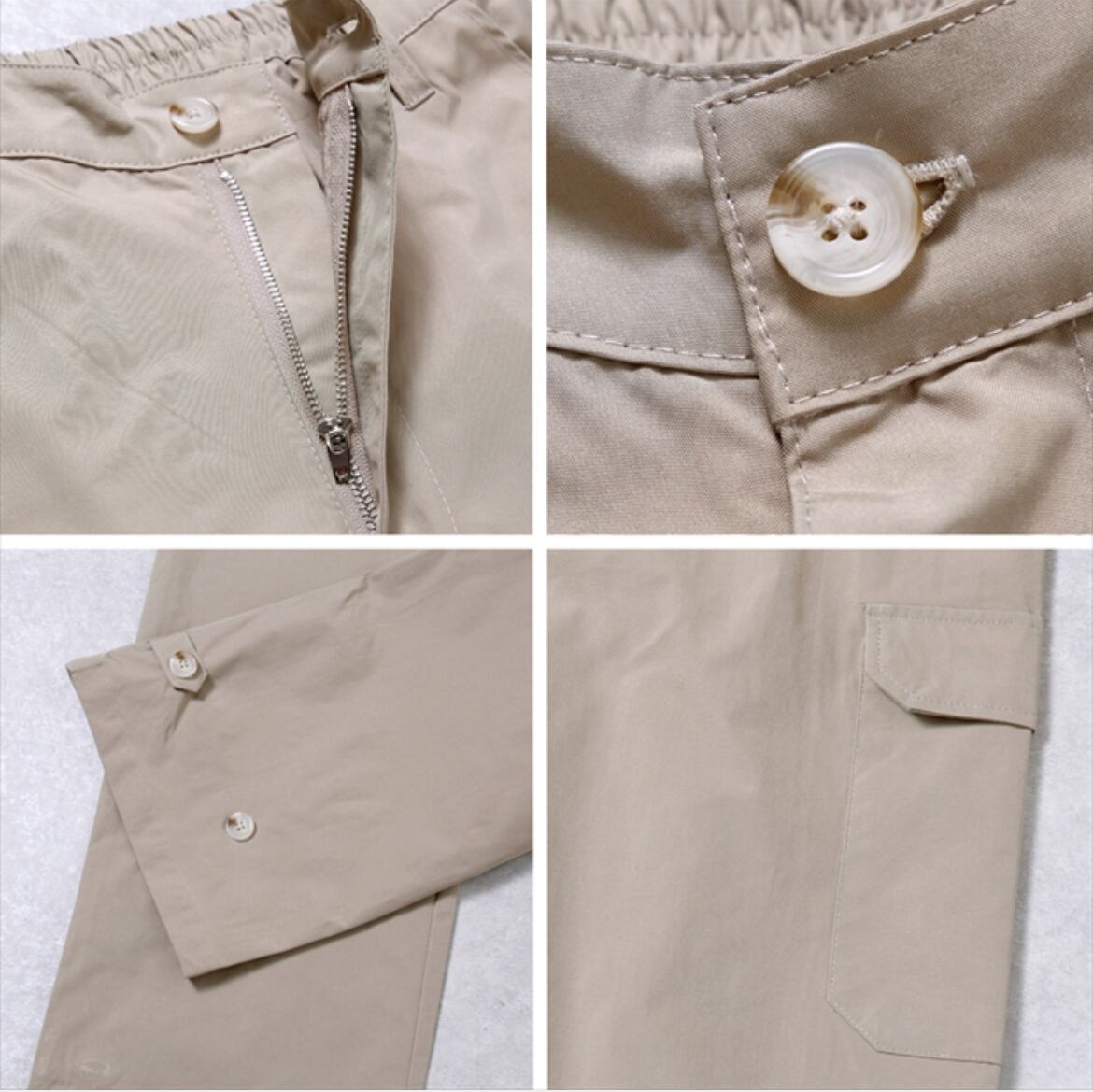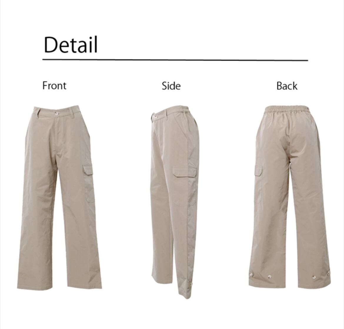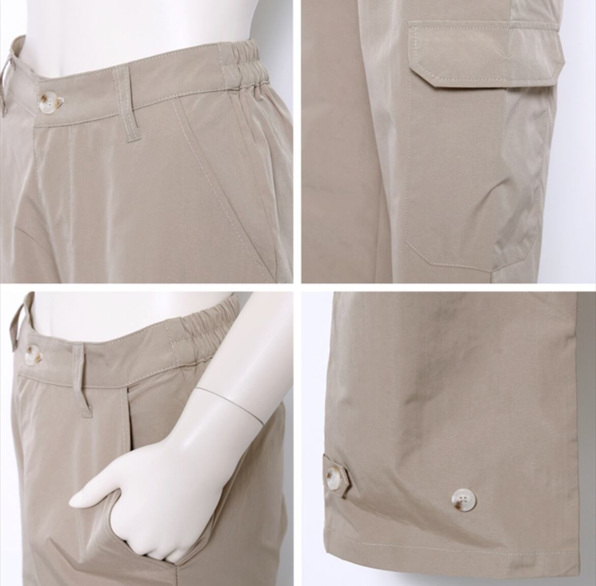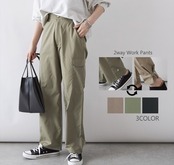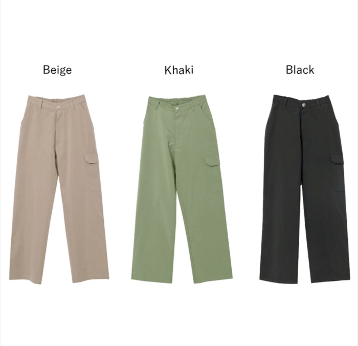 サラッとしたシャリ感のある素材の2WAYワークパンツ。裾に二段階調整可能な釦つきでワイドパンツ・テーパードパンツの2つのシルエットが楽しめます。シンプルなデザインなので、きれいめコーデはもちろん、ラフなカジュアルコーデも品よく決まる万能アイテムです。着心地楽ちんなバックウエストゴムで、フロント部分はボタンとジップでフラットデザインなのでタックインしてもサマになります。パンツの片側にはシルエットを崩さないすっきりとしたデザインのパッチポケット付き◎【素材】ポリエステル100%【裏地】なし【透け感】なし【伸縮性】なし【原産国】中国■サイズ着丈:100ウエスト:66-85ヒップ:101裾幅(ぐるり)広げた状態:46裾幅(ぐるり)狭めた状態:36股上:30股下:70わたり周り:62※身幅、ウエスト、ヒップ、裾幅、袖口は1周のサイズです。◆注意事項: 撮影時のライティングや撮影場所により実際の商品と色味が異なって見える場合がございます。
